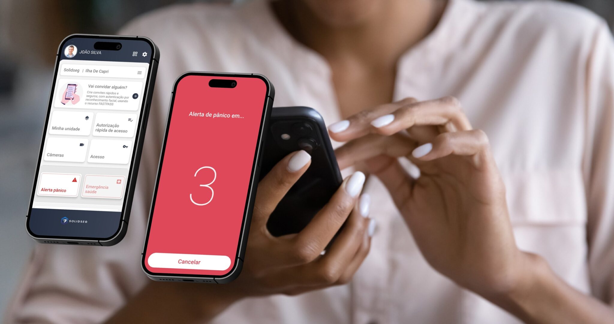 Ao abrir o aplicativo, os moradores dos condomínios protegidos pela SOLIDSEG têm acesso direto ao botão de pânico na página inicial. Com um toque, eles enviam um alerta de pânico para todos os moradores de sua unidade, incluindo familiares, além de enviar um alerta instantâneo para o operador da Portaria.